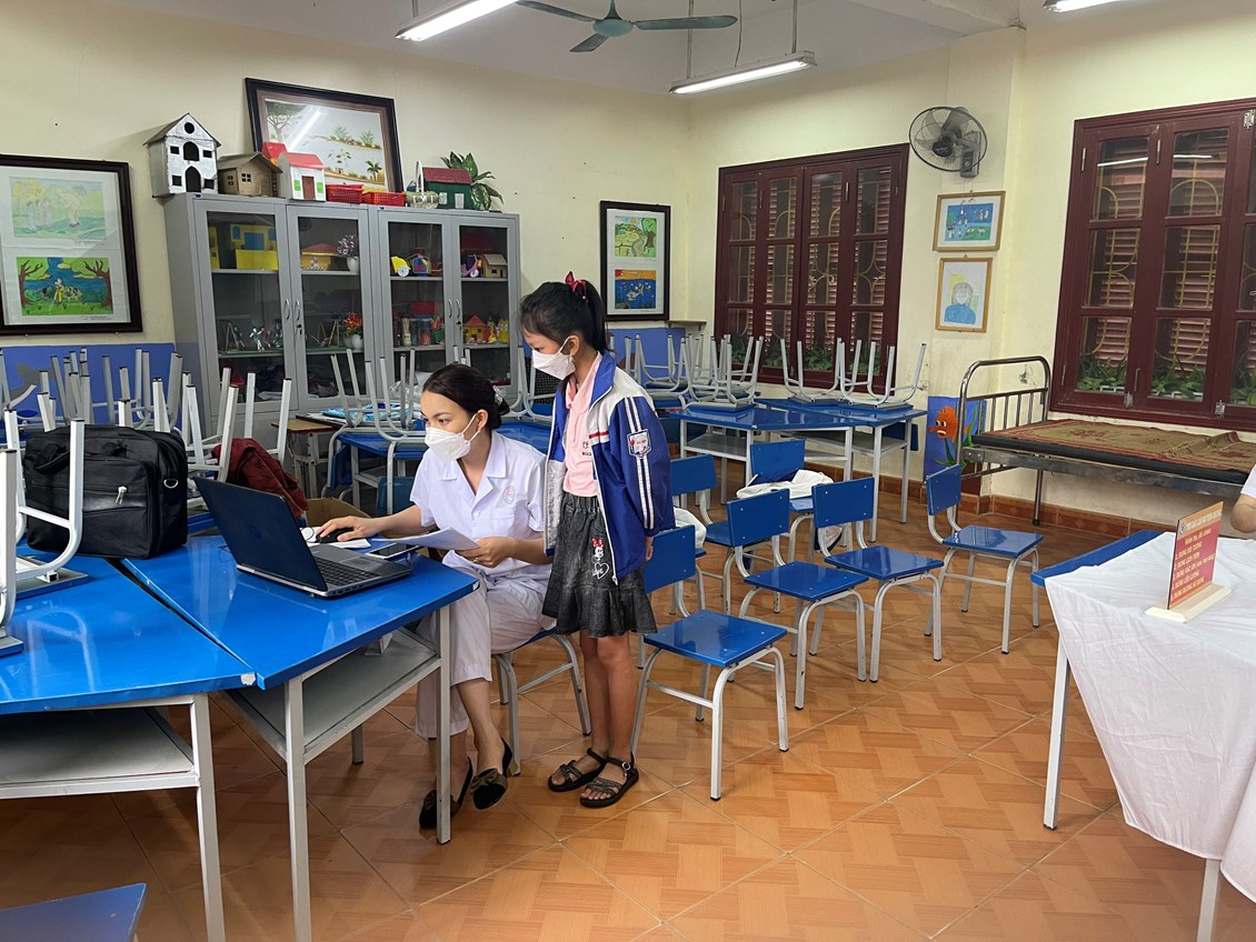 Tất cả học sinh trước khi tiêm được cán bộ y tế hướng dẫn ghi thông tin, số điện thoại liên hệ, mã định danh cá nhân, thẻ BHYT. 100% học sinh trước khi tiêm điều được tư vấn và giải thích hướng dẫn kỹ càng, khám sàng lọc trước, trong và sau khi tiêm và khi trở về nhà tự theo dõi đúng quy trình, kèm theo các thông tin và số điện thoại cần thiết để liên lạc tư vấn sau tiêm. Tất cả những em đủ điều kiện được tiêm, sau tiêm đều được ở lại theo dõi đủ thời gian 30 phút.